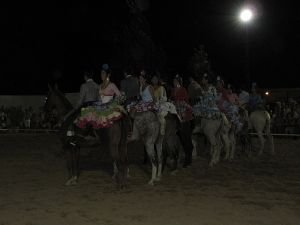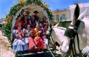 Oslavy (fiesta, feria) mívají často podobu pouti odněkud někam. Původně mívaly náboženský význam cesty k určitému křesťanskému poutnímu místu, dnes jsou „dobrou" záminkou pro několikadenní společenskou událost, při níž se objímá každý s každým, každý s každým pije, vymění si novinky, tančí se, hraje na kytaru, zpívá a všelijak jinak se zejména muži předvádějí. A co by to bylo za Andalusana, kdyby k tomu neměl koně? A tak v procesích vedle pěších jedou povozy tažené tu mulami, tu voly, tu koňmi a vedle nich jdou (často také kluso-jdou rytmem zde důvěrně popisovaným jako pi-pi-pi :-)) koně pod sedlem. Na drtivé většině z nich sedí muži, protože kolem koní tu najdete žen pomálu, a když už, tak jsou to většinou cizinky. 🙂 A za leckterým mužem pak sedí i žena ve volánových šatech, ovšem ne obkročmo, jak se často v zahraničí prezentuje, ale bokem způsobně s nožkama u sebe, na polštářku na zádi koně a jednou rukou objímá svého španělského „macho". To je španělská „seňorita".