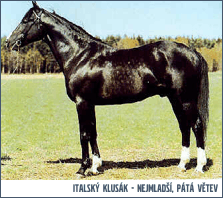 e.) Dnes můžeme hovořit i o nejmladší, rovnocenné páté větvi, jíž je klusák italský, vzniknuvší křížením předchozích s převažujícím podílem klusáka amerického (logicky pro jeho rychlost). Plemeno vstoupilo ve větší známost až vítězstvím představitele tohoto plemene v Prix d’Amerique, klusáka jménem Varenne.