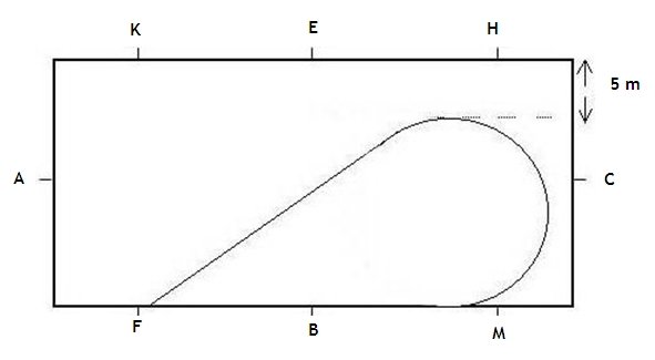Je dobré ještě poznamenat, že i když se cvik jmenuje „půlkruh o průměru 15 m", je třeba, abyste ho projeli přesně, udělat trochu více než půlkruh, abyste se vrátili na stěnu hladkým pohybem.