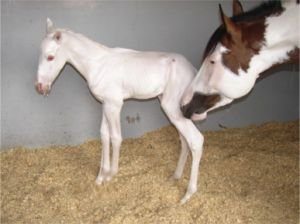 Genetické testy strakatosti odhalují dědičné vadyJiným obvyklým vzorem strakaté bílé, hlavně v chovech plemen quarter horse, paint, pinto a minihorse, je zbarvení Overo – O. Vědci objevili příčinné mutace tohoto zbarvení v genu endothelin-B receptoru (EDNRB) již v roce 1998. Výzkum byl akcelerován snahou omezit úhyny bílých hříbat (overo lethal white syndrome, OLWS) která se rodila s přibližně 25% pravděpodobností ze spojení koní Overo a také nápadnou podobností symptomů nemocných hříbat se zákeřnou lidskou Hirschsprungovou chorobou. Výsledkem studií byl jednoduchý, přímý genetický test, který odhalí dominantní alelu OO a umožňuje vhodnou plemenitbou předejít OLWS u narozených hříbat.