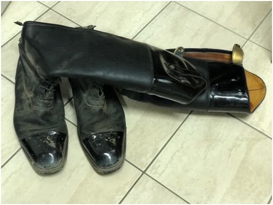 5) Vyčištěné boty zpevněné lýtkovými vzpěrami. Protože se jedná o velmi měkké boty, oblast chodidla je navíc vyplněná igelitem, aby se nebortily na nártu.