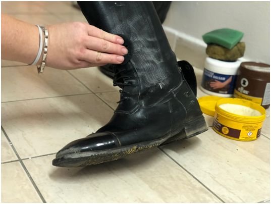 Boty je nejdříve potřeba vyčistit sedlovým mýdlem (Effax, Passier, Stubben, … je to jedno), zbavit je důkladně všech nečistot, a poté je nezbytné kůži namazat. Samotné sedlové mýdlo boty krásně umyje, ale používáme jej samozřejmě s vodou, a namáčení kůži vysuší. Ta je potom výrazně náchylnější k praskání a také velmi rychle nasákne vlhkost z okolního prostředí.