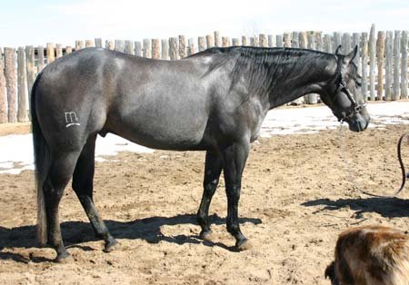 Tento kůň má hodně osvalenou záď, zejména stehna. Má strmější pánev, ale jakou má délku? Je „dobrá"? Osvalení na předku ztěžuje vyhledání ramenního hrbolu.