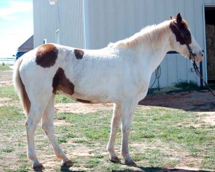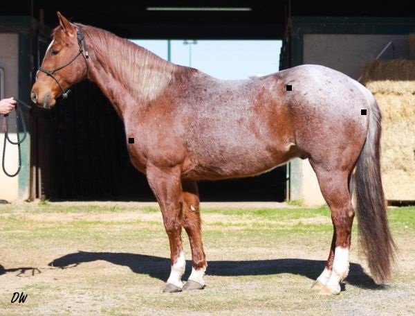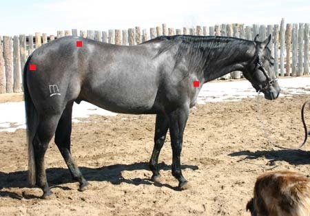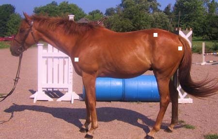 Prokvetlá srst tohoto koně nám trochu ztěžuje hledání kyčelního hrbolu, ale má malý tmavý flíček na pravém okraji hrbolu. Ramenní hrbol je snazší najít. A teď, než budete měřit, zdá se vám, že má tento kůň tak dlouhou kyčel jako ten předchozí, nebo kratší? Pokud kratší, myslíte, že je to ještě pořád „výborná" délka?