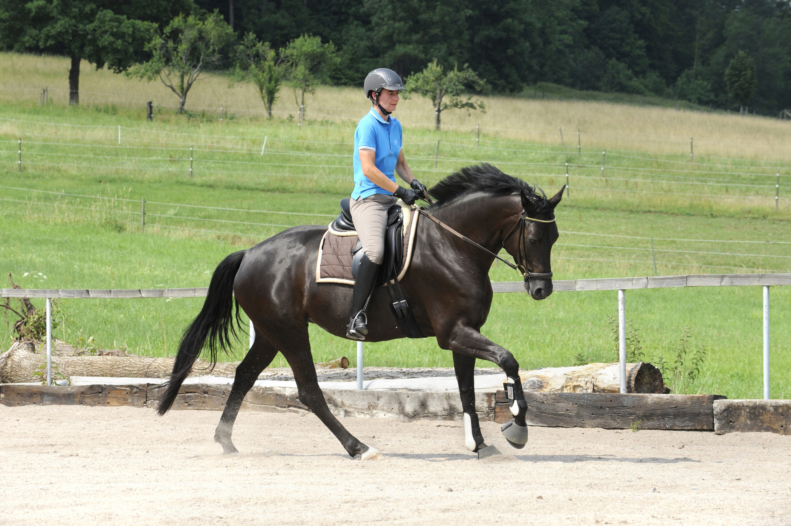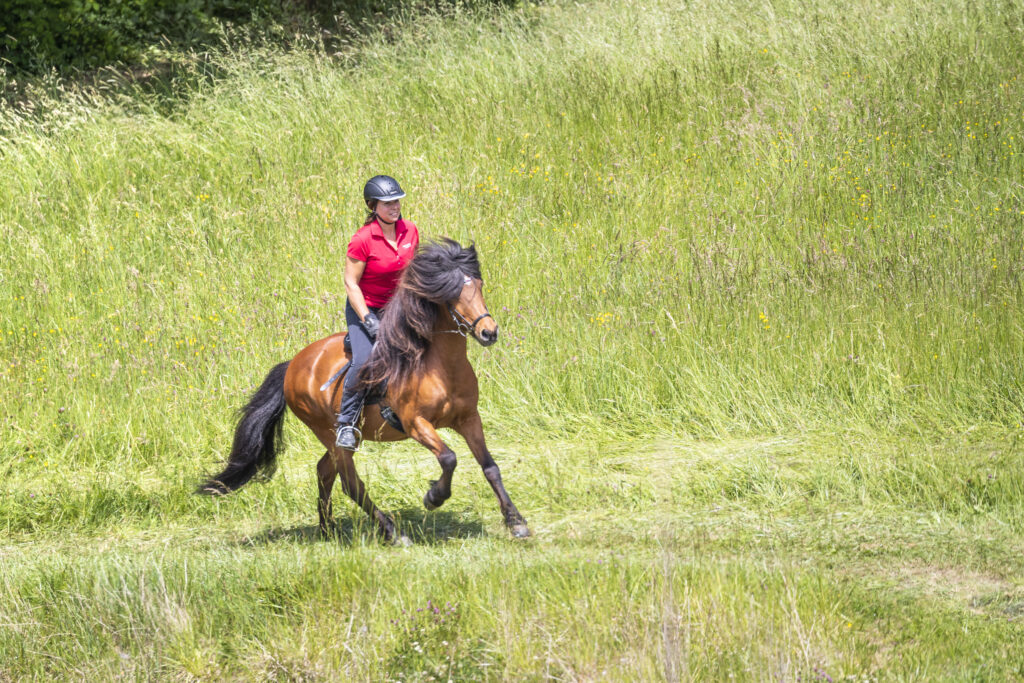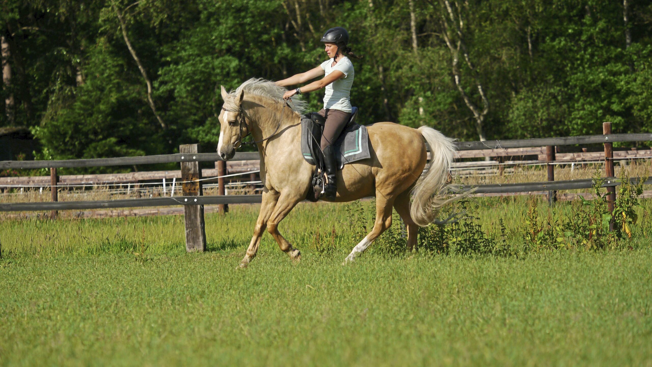 Tip z praxe: Bianca Rieskamp ukazuje přejetí po hřívě ve cvalu – kůň se nese sám, v rovnováze, i když je kontakt s otěží přerušen.
