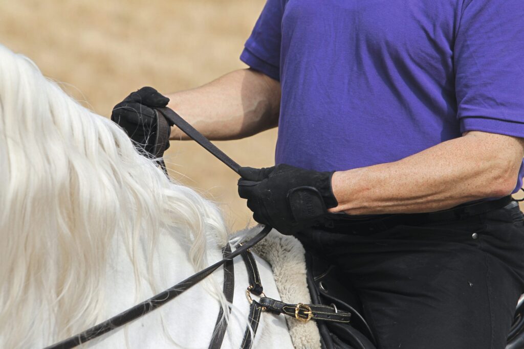 Druhou rukou uchopte otěž vycházející z dlaně a zkraťte ji tahem do strany.