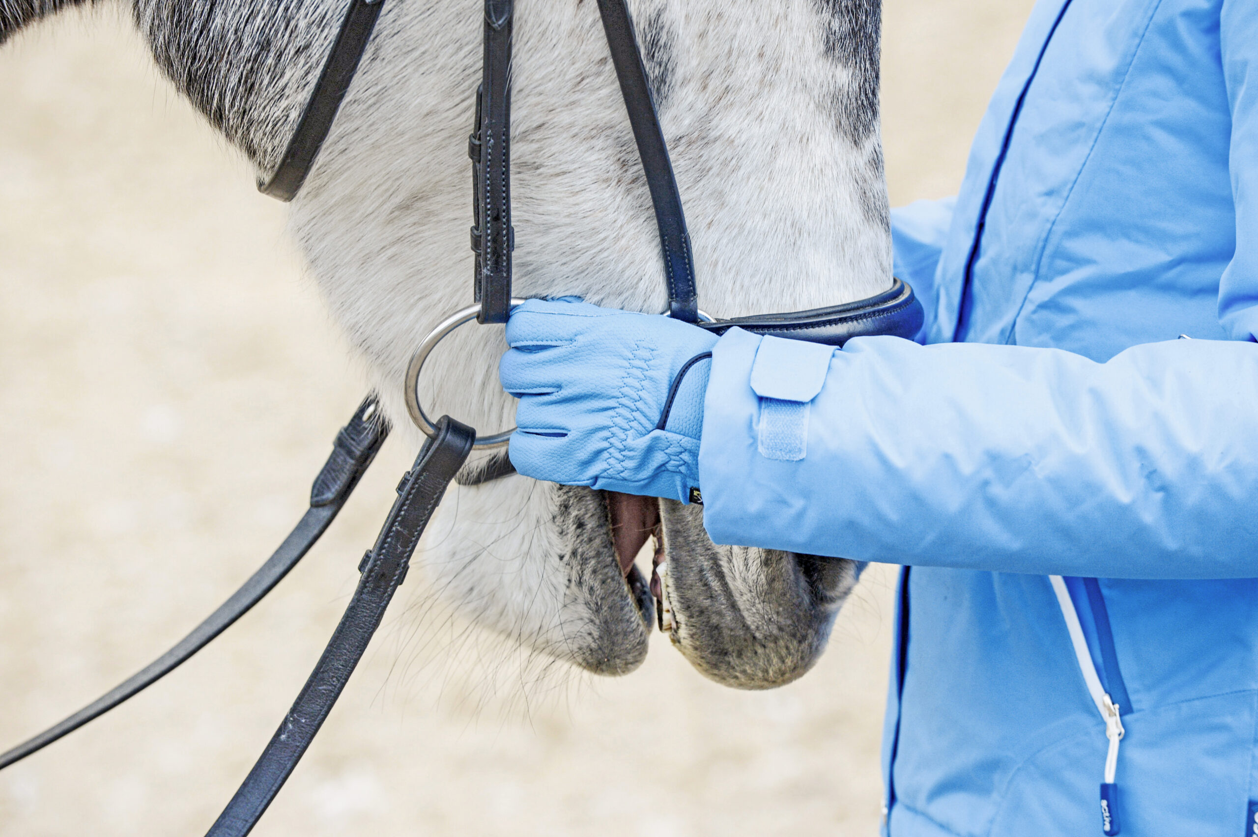 Cvičení ze země: Postavte se před koně, chyťte kroužky udidla a palce položte na jeho konce. Pohněte jimi a vytvořte lehký tlak směrem k jazyku.