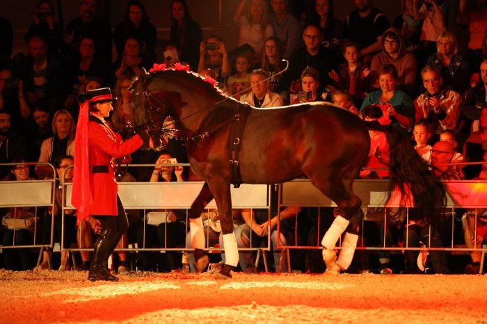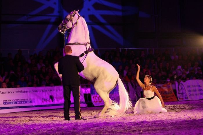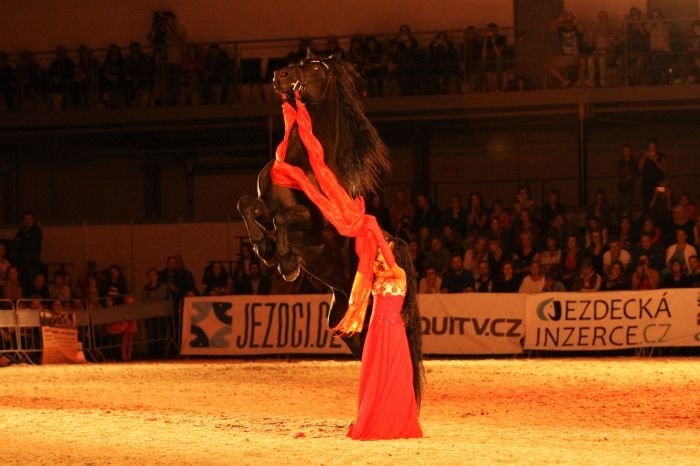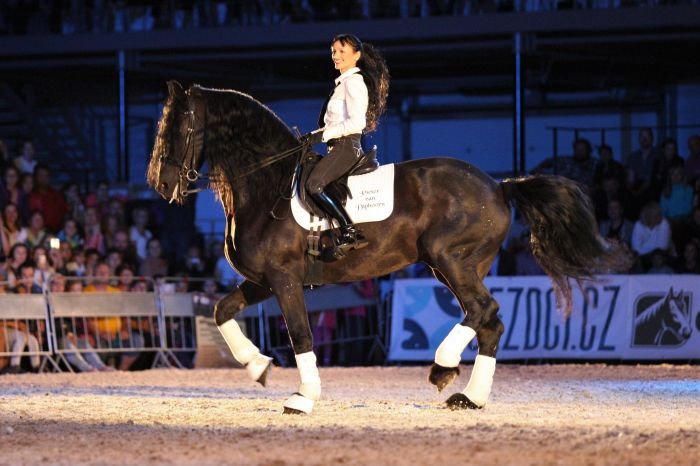 Vendula Šponarová a její fríský hřebec Pieter van Diphoorn jsou pravidelnými účastníky večerního programu v Lysé nad Labem. V prvním vstupu byl Pieter van Diphoorn předveden pod sedlem.
