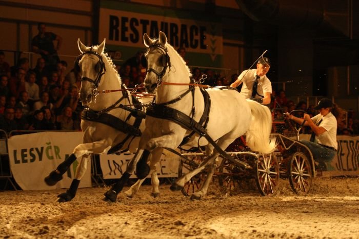 Závěr sobotní večerní koňské galashow. Na předvadišti se sešli kladrubští koně z NH Kladruby nad Labem a lusitáni z Escola Portuguesa de Arte Equestre. Nebylo od věci si připomenout, že starobylé plemeno lusitano má svůj podíl na vzniku naší „živé“ národní kulturní památky, kterou je právě starokladrubský kůň.