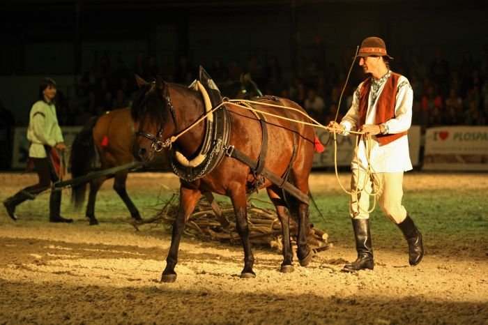 Jako další se v galashow prezentovala čtveřice huculských koní Farmy Cunkov. Ukázka pracovní využitelnosti tohoto plemene pod sedlem a v zápřeži odkazovala k tématu oslav sto let od založení republiky. Huculský kůň totiž patří k původním plemenům koní České republiky a je veden jako genetický zdroj.