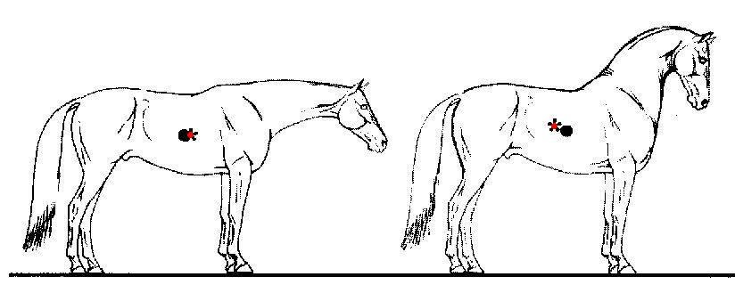 Když kůň stojí, jeho těžiště se nachází těsně pod linií spojující tuberculum major humeru (hmatatelný výběžek na pažní kosti u ramenního kloubu) a sedací hrbol, přibližně na úrovni 14. žebra (obr. 4). Jak vidíte, těžiště koně se nachází blízko místa, kde leží sedlo.