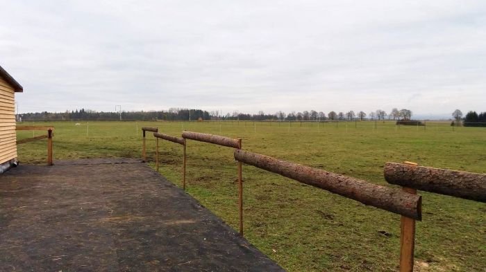 Před přístřeškem se nachází menší dřevěná ohrada – paddock, kde lze koně zavřít v případě opravdu hojných srážek, aby se výběh nadmíru nerozbahnil. Celá plocha paddocku je vykobercovaná, část koberců je položená normálně na zemi na trávě a část před krmištěm a před vchodem do přístřešku na udusaném kameni s prachem. Koberce jsou do země ukotveny plastovými kotvami, u kterých nehrozí poranění koně… Vykobercovaný mají dokonce i přístřešek, prozatím v tom shledávám jen pozitiva – měkký povrch, moč, co projde skrz podestýlku, projde i skrz koberce až do kamenitého podloží a nečpí koním pod nos, jako když například stojí na betonové podlaze…