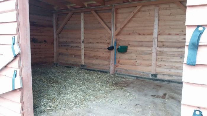 Na něj nepřímo navazuje z jedné strany krmiště o velikosti 3×3 metry, které je uvnitř přepaženo dřevěnou zábranou, za niž se koně nedostanou. Krmiště je vybudované na 2 velké balíky sena, které se sem navalí bočními dveřmi a koníci k nim mají celodenní přístup. Z druhé strany přístřešku pro koně se nachází buňka, kterou využívám jako sklad krmiv a veškerých potřebných jezdeckých a ošetřovatelských pomůcek.