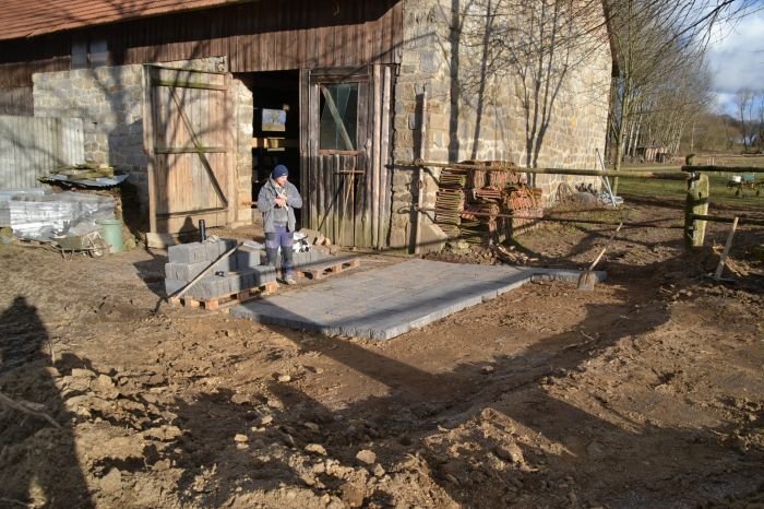 Po načtení nesčetných diskuzí, jak plochu zpevnit (aby šla zároveň dobře kydat, vydržela nejméně 10 let bez újmy a především nás finančně nezruinovala) jsem došla k závěru, že položíme betonovou zátěžovou dlažbu. Pokládali jsme ji, vzhledem k tloušťce betonu, přímo na hlínu.