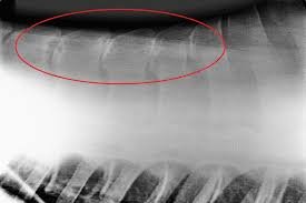 Toto je RTG snímek páteře koně, který trpěl bolestmi zad, nicméně i přesto byl jezditelný, jen vykazoval diskomfort pod sedlem. Žlutě jsou zvýrazněna místa, kde pozorujeme důsledek kontaktu trnových výběžků obratlů k sobě navzájem. Vidíte, že postižená oblast je poměrně rozsáhlá.