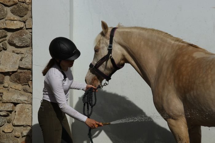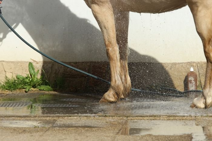 Voda a její následné odpařování intenzivně ochlazuje a sprchování je proto jedním z nejúčinnějších způsobů, jak snížit tělesnou teplotu. Chladná voda je dobrá, ale ideální je voda vlažná (ne horká!). Naopak – pro optimální účinek je ledová voda nevhodnou volbou. Nemyslete si, že čím chladnější voda je, tím lépe. Ledová voda není vhodná, protože způsobuje další tlak na již tak přetížený krevní oběh. Pokud se kůň po postříkání vodou zmenší nebo udělá kočičí hřbet, je voda zjevně příliš studená.