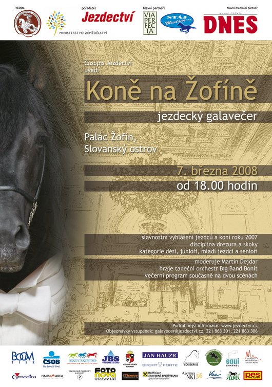 Galavečer Koně na Žofíně získává každoročně na oblibě, což mj. dokládá skutečnost, že přes loňské navýšení kapacity sálu bylo více než týden před akcí naprosto vyprodáno. Letos jsme se tedy rozhodli rozšířit prostory o malý sál s kapacitou zhruba 150 osob, který se nachází v přízemí Žofína. Tato novinka nám umožnila také vytvoření tzv. Malé scény, kde budou nově probíhat vyhlášení jezdců roku 2007 v mladších kategoriích – tzn. děti, junioři a mladí jezdci. Krátce po skončení této úvodní části se program přesune do hlavního sálu na Velkou scénu, kde budou vyhlášeni hlavní ceny celého večera. Vedle ČSOB Poháru Jezdectví 2007 to budou seriálové soutěže a vrcholem se stanou již tradičně kategorie koní a seniorských jezdců roku 2007.