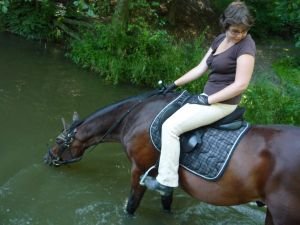 vodaTaktéž se hodí "naučit" svého koně pít z potoka (jak to provést se mě ale neptejte, můj kůň pije z potoka automaticky :). Vodních toků jsme během cesty potkali dost, hospod už méně, počasí bylo docela teplé a tak jsme koním umožňovaly se u každého brodu napít. Ne všichni ale tuto možnost využili – nejsem si jistá, zda neměli žízeň (i když tomu se mi nechce věřit) nebo nechápali, co se po nich chce – ale některé z koní jsem po cestě neviděla z potoka pít ani jednou. Ve většině míst, kde jsme zastavovali, nám sice poskytli kýbl s vodou, ale ne vždy lze spoléhat na možnost zastávky v "civilizaci" nebo na ochotu "domorodců", a tak je kůň pijící z potoka výhodou. Že by se kůň vody neměl bát a měl by být schopen bez problémů absolvovat brody, je myslím samozřejmé. I když mezi námi byli tací, kteří se spolehli na přiježděnost a důvěru v jezdce a koňovi ukázali asi první brod v jeho životě až na čundru. Překvapivě čumílek Rusty očekávání nepotvrdil a neměl problém.