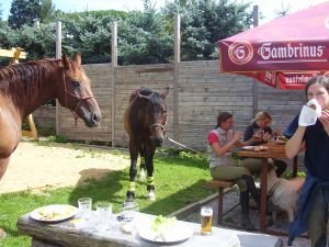 Nebyl tak problém si na první zastávce v klidu zkonzumovat oběd, zatímco na druhém konci vodítka přehozeného přes mé rameno stanipochrupoval kůň (ok, abych ho nevyzdvihovala do nebes – pár něžných drcnutí myšlených jako otázka "a pro mě by tam něco nebylo?!" mu budiž odpuštěno). Nemusím doufám zdůrazňovat, že pokud uvázat, tak nikdy ne za otěže a že i u sebehodnějšího koně je potřeba počítat s tím, že se může leknout a úvaz přizpůsobit tomu, aby se v takovém případě nezranil nebo neodešel s polovinou plotu.