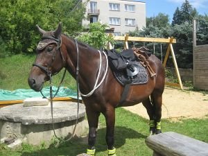 staniZačneme asi tím nejdůležitějším a to je kůň. To, že by měl být dobře ovladatelný a poslušný pod sedlem i na ruce a zvládat se bez problémů pohybovat v terénu považuji za samozřejmost a snad to ani nemusím zmiňovat. Je také žádoucí, aby byl dobře navyknut na silniční provoz – i přes to, že jsme měli vytyčenou trasu po koňostezce a turistické značce, jsme se několikrát poměrně delší dobu pohybovali po silnici, a to mnohdy i v nepříliš přehledných úsecích (serpentýny, křižovatky, most přes řeku apod.). Jakákoliv neposlušnost nebo bázlivost koně by mohla být v takových situacích nebezpečná. Dále je vhodné naučit svého koně klidně stát i delší dobu – pokud bloudíte a studujete co pět minut mapu, nervozní a popocházející kůň vám to rozhodně neulehčí. Stejně tak další úkony jako pití, smrkání, upravování oděvu, telefonování pro záchranu se na odcházejícím koni trochu komplikují. 🙂