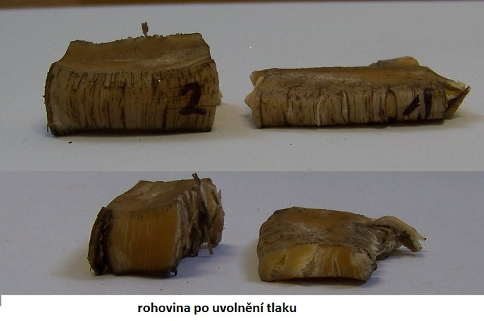 Suchý vzorek označený číslem 1 se vrátil k původní výšce pouze o 2 mm, má výšku rovnoměrnou 6 mm a zřetelné povrchové praskliny po celém obvodu. Namočený vzorek označený číslem 2 má výšku nestejnoměrnou. Po obvodu se vrátil téměř na původní rozměr 11 mm a střed vzorku nahoře i dole vytvořil důlky hluboké přibližně 1 mm. V rohovině se nevytvořily žádné nové okem viditelné praskliny.