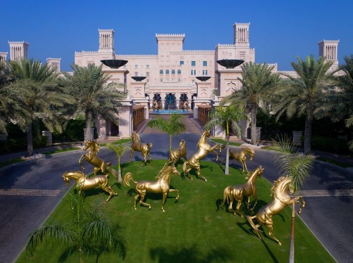 Když už jsme na Středním východě, zamíříme do Dubaje před pětihvězdičkový hotel Al Qasr Madinat v Jumeira. Příjezdová cesta vede nádvořím, kde 18 zlatých arabských koní v 1 a čtvrt životní velikosti tančí na trávníku. Přesněji – jsou pozlacení. Když už byste se tam jeli ubytovat, uvidíte je zblízka. Temperament arabských koní věrně ztvárnil sochař Danile Jager z Jihoafrické republiky. Bylo to jeho poslední dílo, v roce 2003 zemřel. Pokud by vám tito koně nestačili, před hotelem je ještě fontána s osmi torzy koní ve dvojnásobné životní velikosti. Tyto sochy jsou z bronzu. Koně a motivy koní jsou v Dubaji na každém (luxusním) rohu, tak nějak v duchu slov vládce Dubaje, šejka Mhm bin Rashid Al Maktoum – arabští koně se vracejí domů.