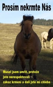 Takže, přátelé koňáci, určitě schovávejte všechny účty za veterináře! Za nákupy podpůrných prostředků a léčiv v případě dietetických obtíží zvířat vzniklých z důvodu nepovoleného Krmičství. A nebojte se na rezistentního souseda, který i přes upozornění, přes výstražné cedulky na vašich ohradách, přes domluvy a seriózní napomínání (natočte si tyto akce ‒ a buďte při nich VŽDY klidní a slušní!) opakovaně a umanutě hází koním zbytky, zavolat Policii. Od toho tu jsou ‒ mají pomáhat a chránit, mají se našimi problémy zabývat.