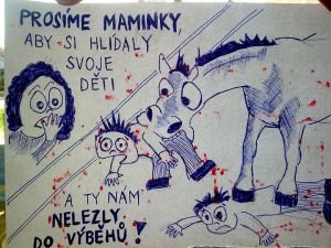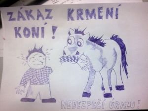 Známá tedy vyrobila cedulky, které poctivě rozmístila co deset metrů po plotě a na které posléze, když byly zcela ignorovány, značně nabroušeně důchodce upozornila: "Lidi, vy neumíte číst? Ne, naši poníci opravdu hlad NEMAJÍ! Tak jako ho nemají vaše vnoučata – a přesto by si ráda od kolemjdoucích vzala cukrovinky, nabízet jim je dobrodějové na ulicích, že? Přece tady megaobrovsky červeně nepíšu ZÁKAZ KRMENÍ pro srandu! Naši poníci se prostě nesmí živit navíc, krom sena, NIČÍM! Jsou tlustí a veterinář v zájmu jejich zdraví zakázal jakékoli příkrmy, opravdu musí být jen na seně, kterého mají ovšem dost, takže vážně NETRPÍ hlady!"