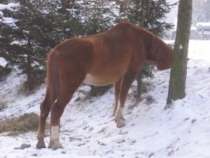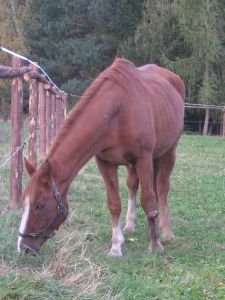 Vykrmit šimlu naštěstí nebylo až tak těžké. Problém v komerční stáji pravděpodobně byla její velká podřízenost vůči jiným koním, takže se mnohdy nedostala pořádně k senu v době, kdy nebyla pastva příliš výživná. Možná i stres ve stádě… kdo ví. Doma se na krmné dávce, podobné té, kterou měl naordinovanou valach, spravila do zimy a během jara se dostala do podoby, v jaké byla před onemocněním vemínka. Horší to bylo s její sportovní kondicí. Od problémů s vemínkem pracovala výrazně méně, než předtím, a poslední půlrok před nastěhováním domů se jen poflakovala na pastvině. Tomu jsem i přičítala občasný výtok z nosu, rychlejší zadýchání se při práci a odkašlávání během ježdění.