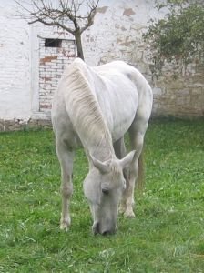 Sedmnáctiletá šimla je taky typický veterinární kůň. Jedním z jejích problémů, který mi před pár lety ztrpčil život a jehož dohry zněly donedávna, jsou melanomy. Před třemi lety se pravděpodobně rozšířily i do vemínka a způsobily těžký zánět poloviny mléčné žlázy. Po dlouhé léčbě se vemínko vyřešilo, bohužel klisna, vždy dobře krmitelná a příjemně kulatá, hodně zhubla a bez individuální „domácí" péče byl problém ji dostat do původního stavu. Podobně, jako valacha, jsem si i ji přivezla pohublou, byť dostávala i přes nicnedělání pravidelně dvakrát denně jádro a od jara do podzimu 2009 pobývala se stádem na několikahektarové pastvině.