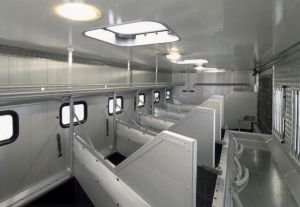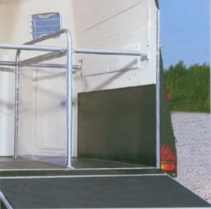 Ano! Tak, jak jsme neopatrnou jízdou vše zapříčinili, můžeme také tento stav podstatně zlepšit a v některých případech i syndrom zcela odstranit. Podstatné je umožnit koni během jízdy se ještě více rozkročit a stoupnout si jinak, nejčastěji zešikma. V přívěsu na koně toho docílíme buďto úplným odstraněním středové přepážky (obrázek 6 pod článkem), nebo alespoň jejím otevřením do boku. Taková přeprava je však specifická a je nutné, aby byla správně „zmenežována". Má-li kůň cestovat bez středové přepážky, musí být uvázán na obě strany (nebo dopředu), aby se v přepravníku nevzpříčil. Vepředu a za zadkem musí mít zábranu přes celou šířku přepravníku (obrázek 7 pod článkem). Nezbytný je kamerový systém a pomocí něj je potřeba přesně sledovat, ve kterém okamžiku a na jaký podnět si kůň lehá na stěnu.