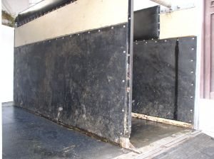 Co se děje ve vleku?Jedeme-li s koněm korektně, kůň se rozkročí a pouze zatáčky vyvažuje, v extrémních situacích, jako jsou např. zmíněné kruhové objezdy, se lehce opře o stěnu, nebo si přešlápne. Pokud ale např. do kruhového objezdu vjedeme tzv. „na prase", vyšší kůň potřebuje prudkou změnu směru kompenzovat větším rozkročením. To mu ale středová přepážka neumožní, a tak to vyřeší tím, že dá nohy naopak k sobě a opře se (doslova se navalí) celou vahou o stěnu vleku nebo přepážku, podle toho, na které straně stojí a do jaké zatáčky jedeme. Nohy, které má u sebe, mu ale začnou podjíždět a kůň začne doslova hrabat po protější stěně. V extrémním případě může dojít až k tomu, že se kůň za nějakou dobu „prohrabe" překližkovou stěnou vleku. Já jsem osobně viděl i prohrabanou stěnu laminátového vleku. Výrobci přepravníků se snaží toto nežádoucí opotřebovávání eliminovat alespoň montováním tzv. okopových desek na boky vleku (obrázek 3).