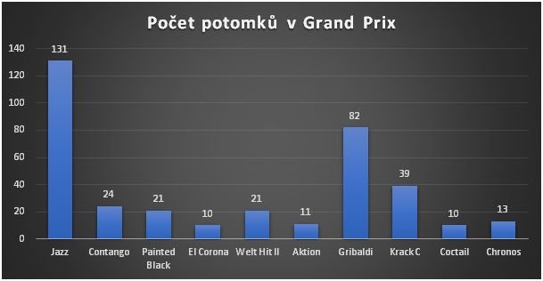 Nejprve se podívejme mezi elitu, tedy otce koní startujících v Grand Prix soutěžích. Nejlepším plemeníkem pro chov drezurních Grand Prix koní je Jazz se 131 úspěšnými koňmi, což je 4,2 % jeho potomků. Hned za ním se drží Contango (24 GP koní, 3,8 %), Painted Black (32 GP koní, 3,6 %), El Corona (10 GP koní, 3,5 %), Welt Hit II (21 GP koní, 3,2 %), Aktion (11 GP koní, 2,9 %), Gribaldi (82 GP koní, 2,7 %), Krack C (39 GP koní, 2,5 %), Coctail (10 GP koní, 2,5 %) a Chronos (13 GP koní, 2,5 %).