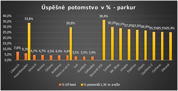 Pokud se ale opět na celou věc podíváme z pohledu %, pak vede Bacardi VDL, neboť parkury obtížnosti 1,30 a výše překonává 36,4 % jeho potomků (pozor, u KWPN má registrováno jen 33 potomků!). Druhý je Heartbreaker (33,8 %), Cantos (30,2 %), Hors La Loi II (29,9 %), Mr Blue (29,1 %) a Utopie (27,9 %).