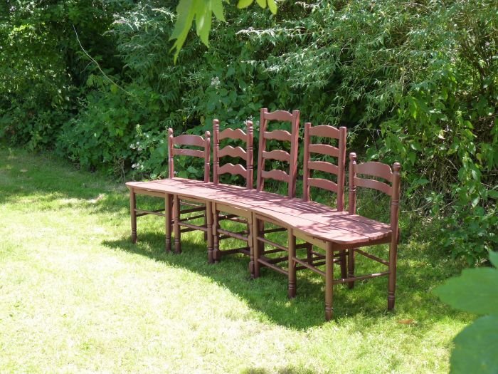 Lavička z židlí. Pokud na půdě nalezneme pár starých židlí se stejně vysokým sedadlem (případně zařízneme nohy tak, abychom se dostali na jedinou úroveň), můžeme jen s minimem šikovnosti vyrobit lavičku během chvilky.