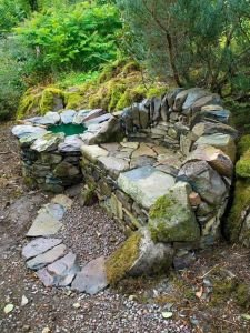 Kruhová lavička – umožňuje výběr místa k sezení podle momentálního požadavku na slunce a stín – velmi praktické! Zde nabízí oddych majiteli při sušení sena…