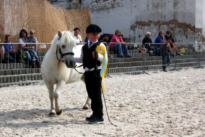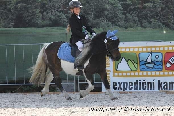 Příklad vyrovnaných tělesných poměrů mezi jezdcem a poníkem: Karolína Kůrková (6let) a Sissi Domino (shetlandský pony, KVH 99 cm). Vítězky soutěže First Ridden, Lysá nad Labem 2014. Foto: Blanka Satranová