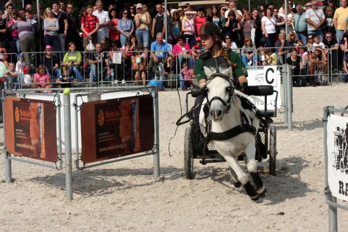 Štěpánka Germeková (14 let) a Ursela van de Herdershoeve (shetlandský pony, KVH 94 cm). Tato juniorka si už na shetlandském poníkovi nezajezdí, ale bez problémů ho může zapřahat. Vítězky kola Vozatajského poháru ČSP v Lysé nad Labem 2014. Foto: Michal Štulík