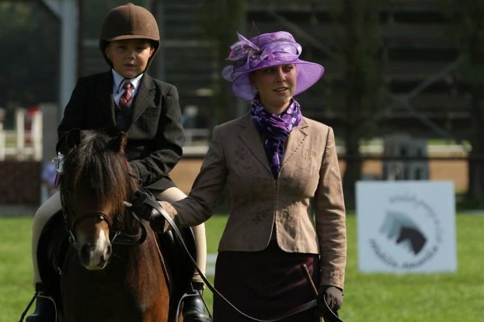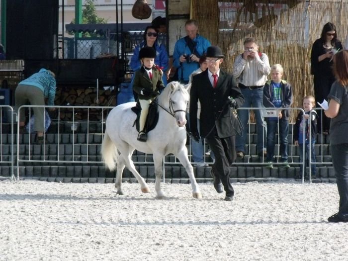 4. Prezentace ve výstavním kruhu a práce vodiče: Ačkoliv se může na první pohled zdát, že vodič je v této soutěži jen na okrasu, opak je pravdou. Na jeho bedrech spočívá veškerá zodpovědnost. Není to až tak složitá funkce v praktickém slova smyslu, přesto vyžaduje vysokou míru koncentrace a zkušeností. Vodič neustále sleduje svého poníka a malého jezdce, protože musí být v každém okamžiku připraven mu pomoci, bude-li to situace vyžadovat. Kromě toho také monitoruje dění v kolbišti a soustředí se na pokyny ringstewarda. Musí vnímat vše, co se děje kolem něj, udržovat dostatečný rozestup vůči ostatním účastníkům a vyhýbat se kolizním situacím. On je tím, kdo odhaduje v krizových situacích míru rizika, protože malí jezdci toho ještě nejsou schopni. Dále k jeho práci patří i správný způsob předvádění. Vodič by se měl vedle poníka pohybovat na úrovni přední nohy, tedy ne táhnout poníka za sebou, anebo ho nechat běžet na dlouhém vodítku před sebou. Jeho úkolem je v případě problému dítě jistit a to nemůže dělat, když běží před poníkem nebo za poníkem. Vodítko drží trošku netypicky v levé ruce, protože pravá ruka musí zůstat volná pro případ, že by bylo nutné přidržet malého jezdce. Už jsme se zmiňovaly o tom, že vodítko není zapnuté do udidla, ale do anglického nánosníku. Mělo by být prověšené po celou dobu předvádění ve výstavním kruhu. Občas vidíme u vodičů snahu ukázat posuzovateli, že si dítě poníka již vede úplně samo. Tito vodiči se sice pohybují na úrovni přední nohy poníka, ale jsou od něj vzdáleni cca 2 metry do strany. Vodítko je samozřejmě prověšené. Tato pozice vodiče mu ale už v případě krizové situace neumožňuje rychle zasáhnout, a proto je tento způsob předvádění vnímán negativně. Často se soutěžící ptají, jak bude posuzovatelem vnímáno, když dítěti s vedením poníka budou pomáhat? Lepšího hodnocení v tomto ohledu samozřejmě dosáhne dítě, které prokáže větší schopnost správně vést poníka bez pomoci vodiče. Ale protože ve výstavním kruhu budeme potkávat i velmi malé děti, které se ještě o vedení poníka mnohdy ani nemohou pokoušet, musí v těchto případech vedení poníka zcela obstarat vodič. Nicméně je důležité zde objasnit ještě jednu věc. Zásah vodiče do vedení poníka nebude hodnocen negativně, když při nějaké kolizní situaci vodič pomůže poníka dítěti zvládnout a umravnit. V takovém případě by od vodiče bylo velmi nevhodné nechat dítě s neposlušným nebo splašeným poníkem bojovat bez pomoci. Pokud by se tak stalo, odrazilo by se to negativně v hodnocení samotného vodiče. Nicméně při kolizních situacích většinou posuzovatel také přihlíží k tomu, jestli tu lumpárnu vymyslel váš poník, nebo byl váš poník do kolizní situace vtažen nějakou souhrou náhod. Pokud by to byl váš poník, který by lumpárnu ve výstavním kruhu inicioval, odrazilo by se to negativně v hodnocení samotného poníka.
