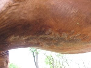 Z klinických příznaků je typické sezónní svědění a kožní změny v oblasti kořene ocasu, hřívy, na spodině břicha a hrudníku, kolem uší nebo v mezinoží. Kůže je na postižených místech zarudlá a tvoří se otoky a krusty, při škrábání se léze prohlubují až na krvácející spodinu (nezřídka dochází k následné bakteriální infekci, léze se rozšiřují a svědí, kůň se stále drbe a kruh se uzavírá), dochází k vypadávání žíní z hřívy a kořene ocasu. Kůň se intenzivně drbe a jeho stav se zhoršuje při pobytu venku.