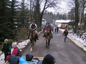 Další „občerstvovačka" byla už pod samotným vrchem Zakletý, který se tentokrát nechal hýčkat sněhovou dekou. Koně tedy zůstali na stanici a nezúčastnili se výstupu, kterým by patrně trpěl namočený povrch sjezdovek. Do nich vystoupali pěšáci, doprovázeni svým radostným halekáním, a koně a dospěláci mezitím odpočívali na úpatí. Nutný přesun po části modré sjezdovky řešil rychlý kilometrový přechod na talíř teplé polévky ve Skiklubu.