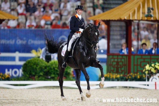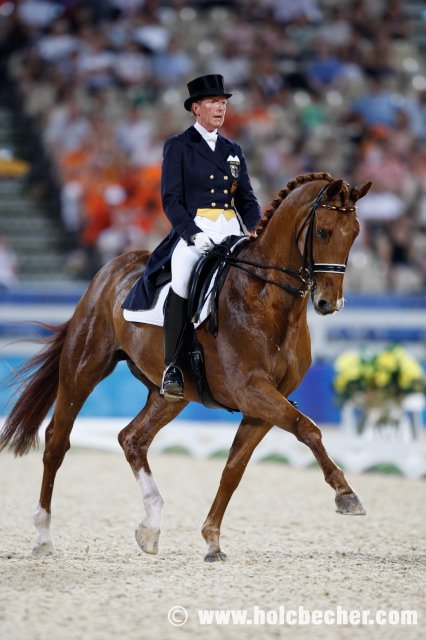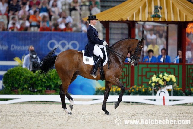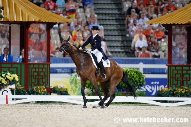 Dnes dlouho vedla Ruska Alexandra Korelova, jejíž 18letý Balagur předvedl vynikající a bezchybný výkon za 71,4 %. Předčil ji až Američan Steffen Peters s Ravelem, který svoji úlohu dokončil 0,4 % lépe. O chvíli později již byla na startu první z favoritek na zlato, Anky van Grunsven na Salinerovi, podle losu startující jako čtvrtá od konce. Vynikající výkon měl jen jedinou chybku – nacválání v klusové traverzále, jinak nasadila Nizozemka vysokou laťku hodnocením 74,96 %. Diváci si mohli trošku oddychnout při úloze Emmy Hindle s Lancetem, která zajela mírně pod očekávání, ale již následující Heike Kemmer s Bonapartem ukázala zcela skvělou jízdu bez jediné chyby a vzhledem k soupeřkám jí chyběla pouze trochu větší výraznost chodů koně. 73 % znamená velkou naději na zisk bronzu, pokud dvojice nepokazí volnou sestavu. Jako poslední musela psychickému tlaku odolávat Isabell Werth a zejména Satchmo. Dvojice zahájila skvělým způsobem prodlouženými klusy a pasážemi, ale po prodlouženém a shromážděném kroku se Satchmo opět vrátil ke starému problému, který ho nepotkal již přes dva roky – při piaffě ze shromážděného kroku nahrbil po třech piaffových krocích hřbet a pozadu odskákal až k ohrazení obdélníku. Poté se Isabell podařilo opět najet do pasáže a celou úlohu dokončila opět s body od 7 do 9, ale přesto se musela smířit s náskokem pouhých 3 desetin procenta oproti vytouženému alespoň jednoprocentnímu náskoku na nizozemskou soupeřku, která je velmi silná v küru. Isabell však má připravený zbrusu nový kür, který poprvé úspěšně a přesto téměř bez přípravy zajela v Cáchách. Takže se můžeme těšit na napínavé úterní zápolení.