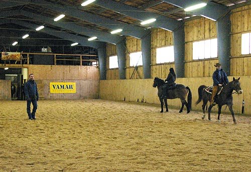 Program začal krátkým úvodem a pak se už jezdilo. Jako první byla práce na kruhu jakožto základní prvek pohybování koně. (Obr.1) Tom vysvětloval sed a držení těla a rukou a opravoval chyby, jednotlivým jezdcům a jezdkyním se věnoval odděleně. Když bylo třeba, sedl si sám do sedla a to, co požadoval po jezdcích, i prakticky ukázal. (Obr.2.) Někdy mu sice byly krátké třmeny, které pro předvedení nepřenastavoval, ale předvedení bylo vynikající.
