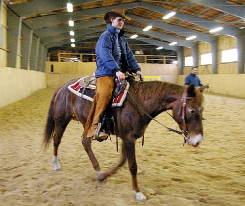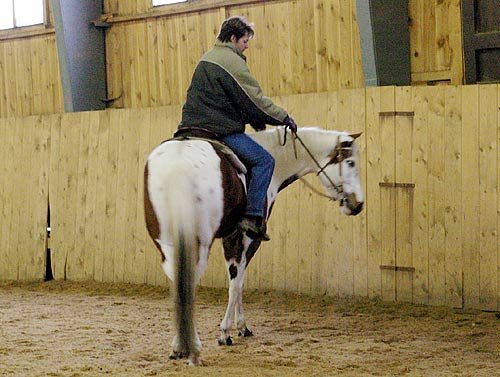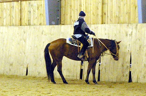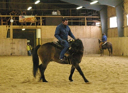 Tom cvičí laterální ohnutí raději v pohybu než ve stoje, je podle něj pak jednodušší naučit koně překročení hrudních končetin, což se nám hodí při spinu. To také názorně ukázal. (Obr.4.) Důležitý je poznatek, že když kůň utíká příliš dopředu, je to tím, že nám nerozumí. Logickým pokračováním pak bylo korektní zastavení. Tom zdůraznil potřebu dostatečného časového odstupu hlasové pobídky od pobídky sedem a následně otěží. Při nácviku je nezbytné dát koni dostatečný prostor, aby si uvědomil, co po něm chceme. Vím, že to je obecně známo, ale bylo dobře, že to zaznělo, protože často vidíme uspěchanou reakci jezdce. Dále se hovořilo o sedu a držení rukou a hlavy. Tom Martínek zdůraznil, že koně musíme učit krok za krokem, nesmíme spěchat a měli bychom mít pro tento účel výcvikový plán a to jak dlouhodobý, tak plán na následující lekci. Je dobré si z kurzu také pamatovat, že kůň se učí vždy v okamžiku, kdy povolíme tlak a on podle toho pozná, že náš požadavek provedl správně.