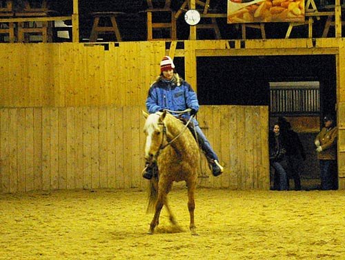 Dalším probíraným prvkem byl spin. Tom předvedl za prvé nácvik spinu z pohybu po kruhu a za druhé s využitím stěny jízdárny. Mezi byl vložen blok o jízdě po rovných liniích. Ty Tom doporučuje jezdit minimálně 2m od stěny, aby kůň nebyl stěnou veden a abychom poznali, pohybuje-li se po rovné lince.
