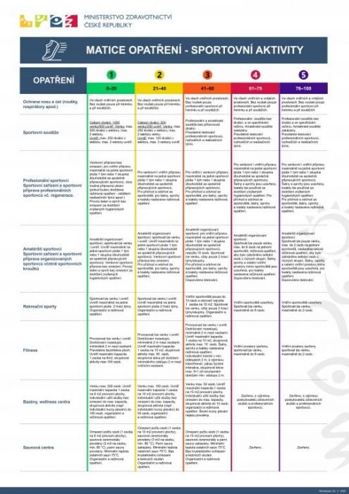 Z těchto důvodů vydalo Ministerstvo zdravotnictví také přehlednou matici k opatřením ve sportu pro jednotlivé stupně protiepidemického systému PES.