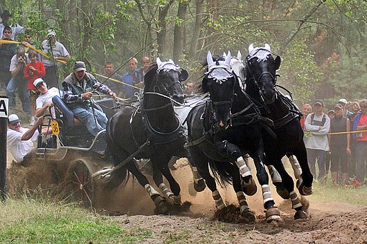 "Počasí pro koně ideální, pršelo jen chvíli. Jinak blázinec – 29 spřežení za den, všechny zkoušky a navíc ještě asi 20 sedlových koní do terénního parkuru. Začal jsem v 8 hodin a skončil v 19 hodin, s jednou 10-ti minutovou přestávkou, takže toho mám docela dost. Příští závod bude na konci června Moravský Krumlov, tak pokud bude možnost připojení k mailu, tak se zase ozvu.