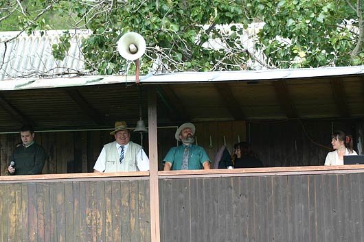 Věž rozhodčích a on-line zpravodajství: zleva komentátor Ing. Radovan Šalek, rozhodčí František Nedbálek a Jiří Zasadil, paní doktorka a Helena Görnerová.