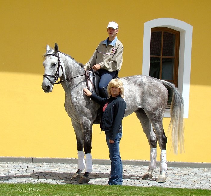Má devítiletá klisna Gomba plemene Furioso je v majetku hřebčínu Motešice a mně byla zapůjčena v roce 2007. Její klady jsou velká síla, prostorné chody a vyrovnanost ve všech třech disciplínách. Mezi největší zápory patří závodní nervozita, náladovost a občasná nesoustředěnost. Dříve byl kros její slabou stránkou, ale nyní je silná ve všech disciplínách. Tedy pokud má den. Její chování by se dalo spíše přirovnat k charakteru hřebce – je velmi vytrvalá, tvrdohlavá, ale když jde nadoraz umí zabrat. Oblíbená činnost je vyhazování, lekání se, všelijaké poskakování a potom následný spánek. Jelikož je bílá a moc čistotná není, tak ji nemine časté koupání, které nepatří k oblíbeným činnostem.