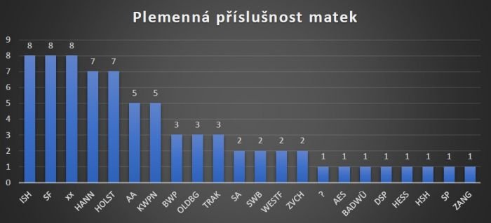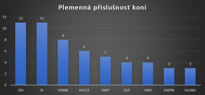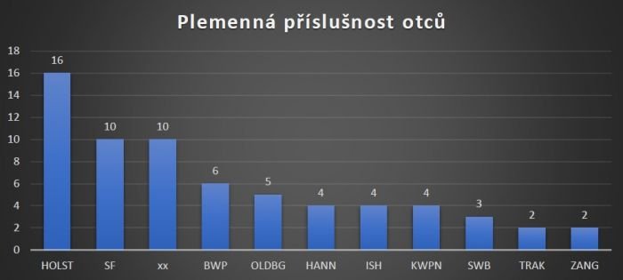Když se zaměříme na plemennou příslušnost otců, dostáváme se už k zajímavějším číslům. Nejvíce potomků měli hřebci s holštýnským výžehem (16). Na druhém místě se společně umístili hřebci plemene Selle Français a hřebci anglického plnokrevníka, a to s deseti zástupci každý. Po šesti měli hřebci BWP, pět koní je potomky oldenburských hřebců a čtyři pak hannoverských hřebců.
